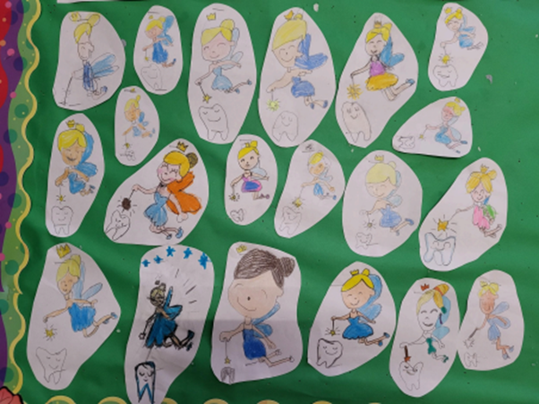 As there are lots of wobbly teeth in our room, we drew plenty of beautiful tooth fairies. We read the books “Bear's Loose Tooth” and “The Toothfairy”.