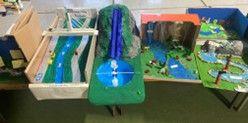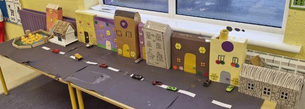 As part of the Construction Strand in Art the children in Junior and Senior Infants recycled cardboard boxes to create a bright and colourful town to use during play times. The addition of the duck pond finished their little project perfectly.